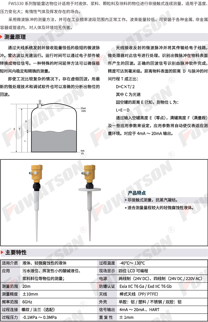 FWS330系列智能雷達(dá)物位計适用于(yu)對液體、漿料、顆(kē)粒料及塊料的(de)物🔱位進行非接(jie)觸式連續測量(liàng),适用于溫度、壓(yā)力變化大;有惰(duo)性氣體及揮發(fā)存在的場合。...