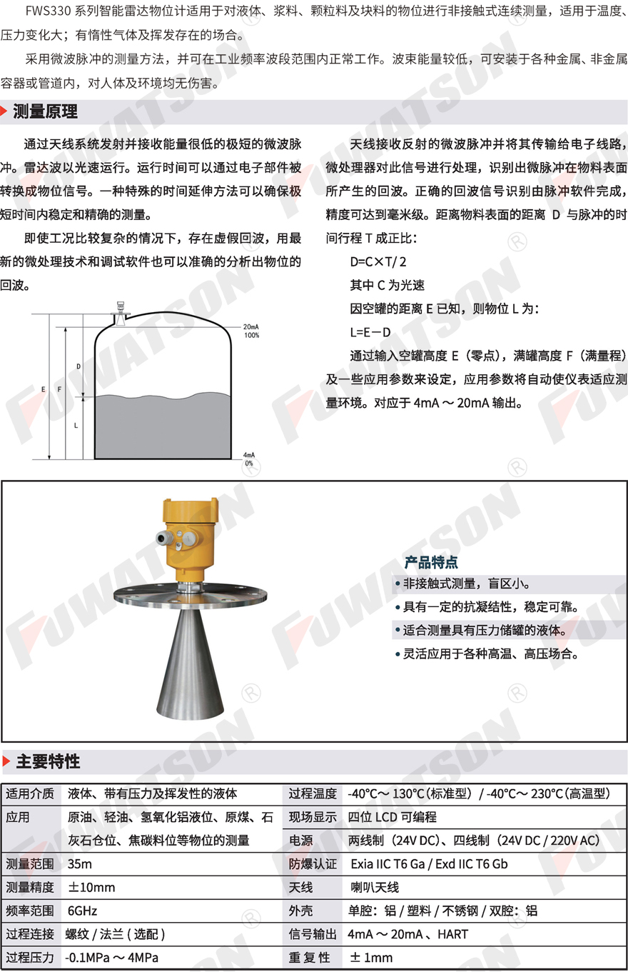 FWS330系列(liè)智能雷達(dá)物位計适(shì)用于對液(yè)體、漿料、顆(ke)粒料及塊(kuai)料的🔴物位(wèi)進行非接(jie)觸式連續(xù)測量,适用(yong)于溫度、壓(yā)力變化大(dà);有惰性氣(qi)☁️體及揮發(fā)存在的場(chang)合。...