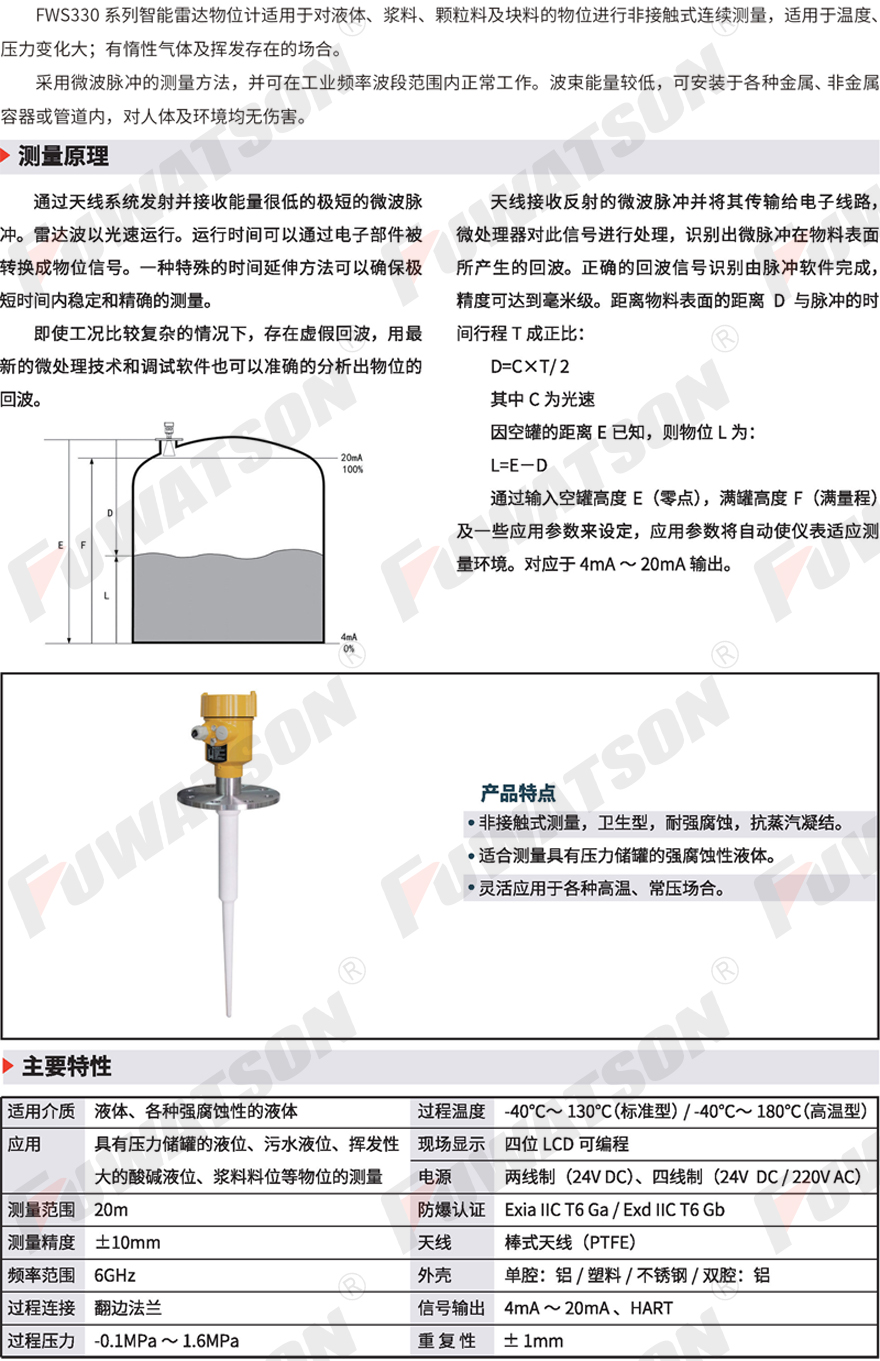 FWS330系列智能雷達物(wu)位計适用于對液(yè)體、漿料、顆粒料及(jí)塊料的物位進行(hang)非接觸式連續測(cè)量,适用于溫度、壓(ya)力變🌈化大;有惰性(xing)氣👈體及揮發存在(zài)的場合。...